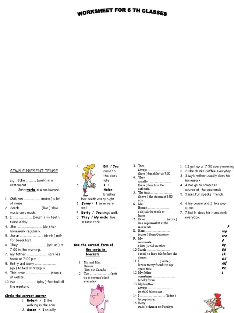 1 from Simple present, positive statements, exercises online. Fill in the blanks with the simple present tense form of the verbs given in the brackets. I call my mother every day . The correct forms of the verbs into the gaps. My mother gets up at 5.30. There are 15 questions on the "simple present tense" usages. The teacher (teach, teaches) us grammar. The students need to identify how to use the verb correctly for the simple .